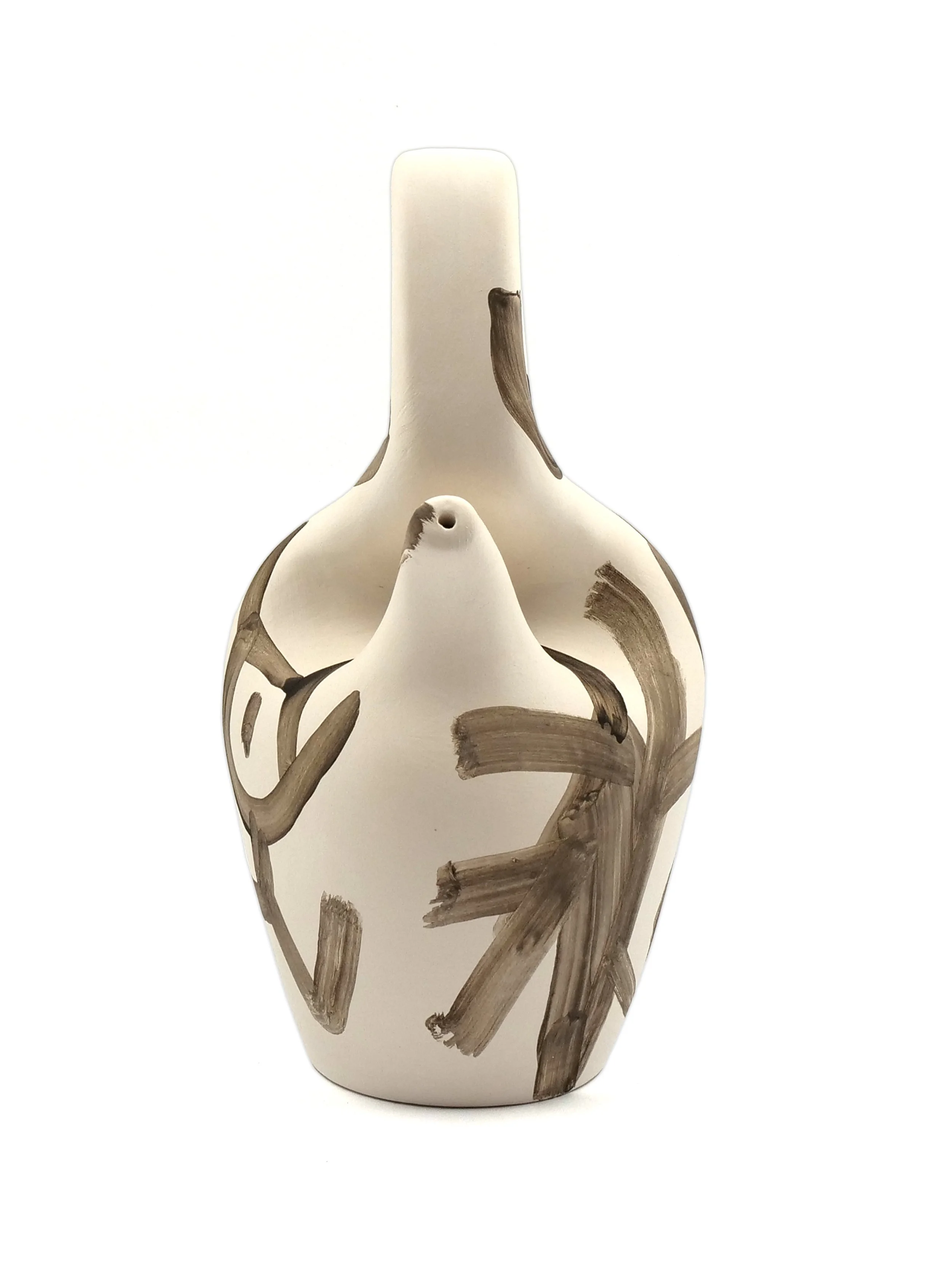 Este botijo es singularmente especial por como Mariscal usa un trazos que se superponen en un aparente caos, líneas que trazan la forma recorren la pieza.